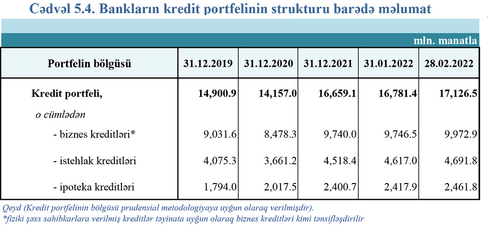 Bankların aktivlərinin 15 milyard 976,2 milyon manatını müştərilərə verilmiş xalis kreditlər təşkil edib. Son 1 ildə sektorun xalis kredit portfeli 22,1 % böyüyüb, kreditlərin aktivlərdəki payı isə 40,6 %-dən 41,5 %-ə yüksəlib.