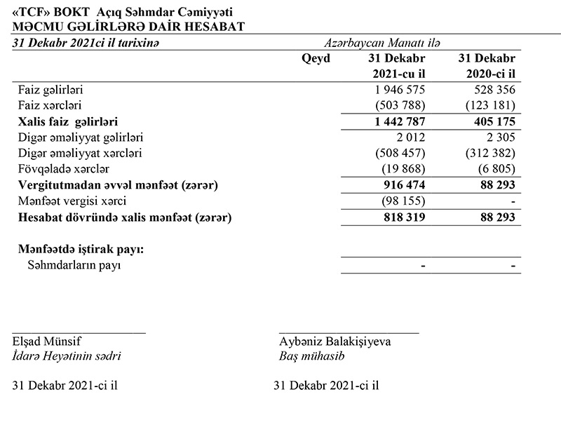 "TCF" BOKT Açıq Səhmdar Cəmiyyəti 2021-ci ili 818 min 319 manat xalis mənfəət ilə başa vurub.