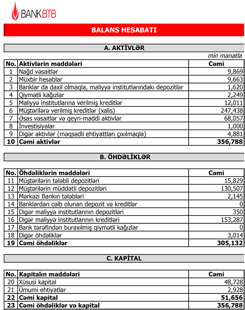 31 Mart 2022-ci il tarixində “Bank BTB” 356 milyon 788 min manat cəmi aktivlərə, o cümlədən 247 milyon 438 min manat xalis kredit portfelinə (müştərilərə verilən kreditlər) malik olub. Bank 2021-ci ilin sonunda 362 milyon 62 min manat cəmi aktivlərə, 251 milyon 54 min manat xalis kredit portfelinə malik idi.