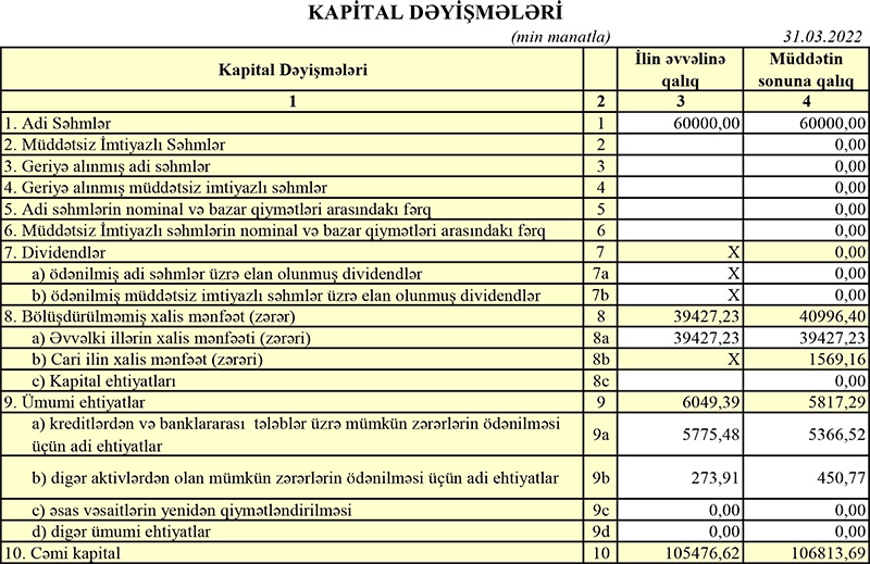Ötən ilin sonunda Bankın depozit portfeli 514 milyon 382 min manat ikən, 31 Mart 2022-ci il tarixində 507 milyon 933 min manat təşkil edib.