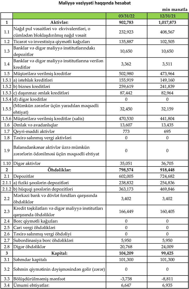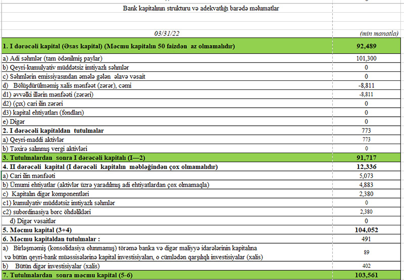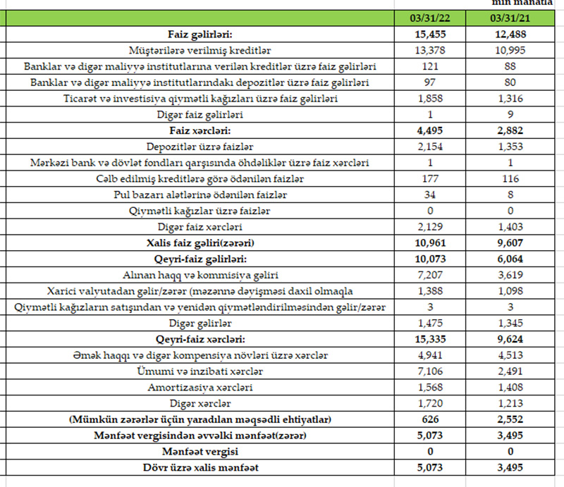 Müqayisə üçün qeyd edək ki, 2021-ci ilin yanvar-mart dövründə “Rabitəbank”ın cəmi əməliyyat gəlirləri 18 milyon 552 min manat, cəmi əməliyyat xərcləri 12 milyon 506 min manat, əməliyyat mənfəəti 6 milyon 46 min manat, mümkün zərərlər üçün yaradılan məqsədli ehtiyatlara ayırdığı vəsait 2 milyon 552 min manat təşkil etmişdi.