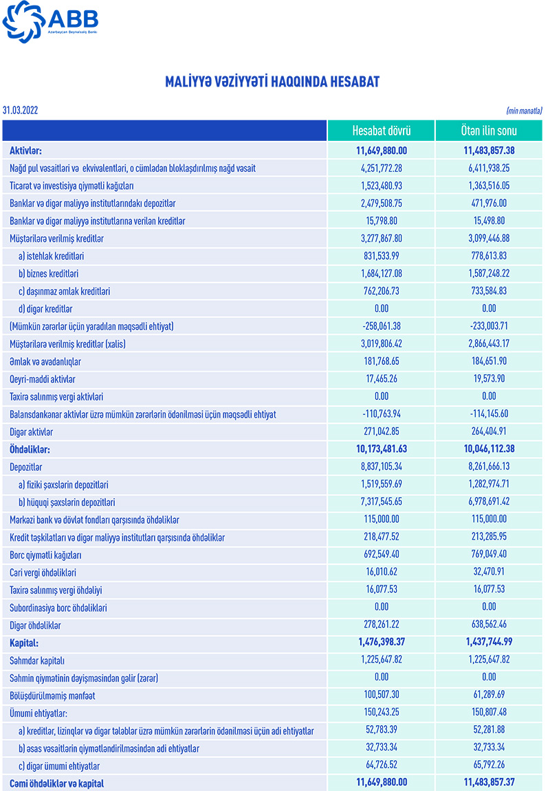 31 mart 2022-ci il tarixində ABB 11 milyard 649 milyon 880 min manat cəmi aktivlərə malik olub. Bank ötən ilin sonunda 11 milyard 483 milyon 857 min manat cəmi aktivlərə malik idi.