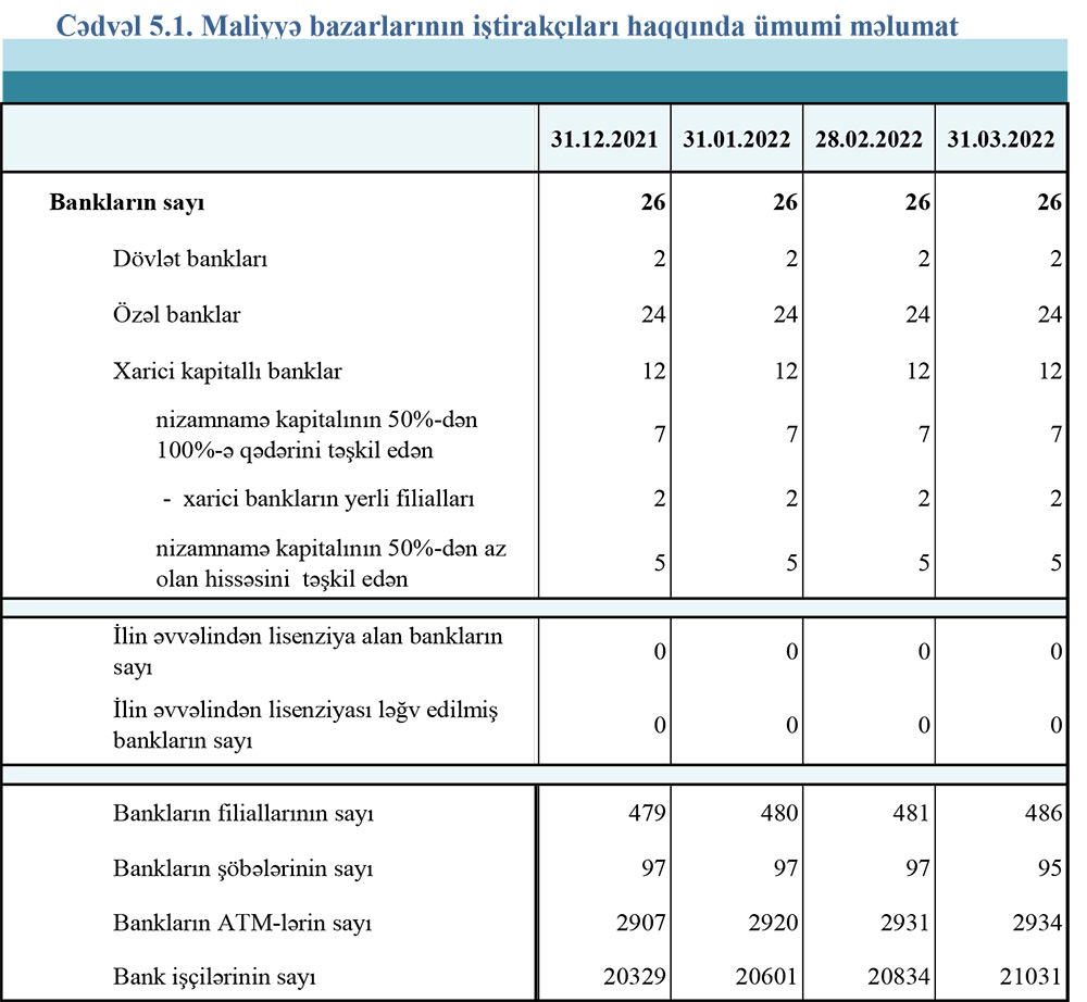 2021-ci ilin mart ayı ilə müqayisədə isə bank sektorunda işləyənlərin sayı 2 min 264 nəfər artıb. Ötən ilin 31 Mart tarixində bank sektorunda işləyənlərin say 18 min 767 nəfər təşkil etmişdi.