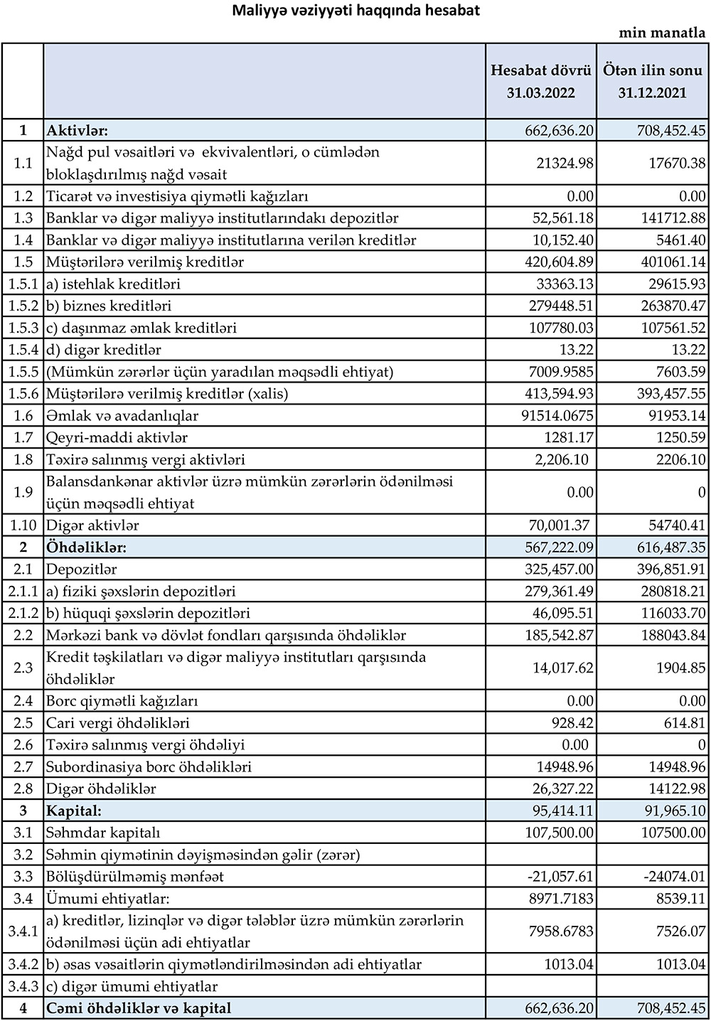 Müqayisə üçün qeyd edək ki, 2021-ci ilin yanvar-mart dövründə “Muğanbank”ın cəmi əməliyyat gəlirləri 15 milyon 600 min manat, cəmi əməliyyat xərcləri 13 milyon 907 min manat, əməliyyat mənfəəti 1 milyon 693 min manat təşkil etmişdi. Bank əməliyyat mənfəətindən 99 min manat ehtiyatlara ayrıdığından həmin dövrü 1 milyon 593 min manat xalis mənfəət ilə bağlamışdı.
