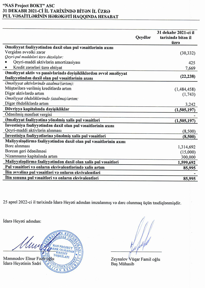 Fəaliyyət göstərdiyi yarım il ərzində kredit təşkilatının böyüklüyü 1,5 milyon manatı keçib.2021-ci ildə fəaliyyətə başlamış “NAS Project BOKT” ASC 31 dekabr 2021-ci il tarixində bitən il üzrə audit olunmuş maliyyə hesabatlarını açıqlayıb.
