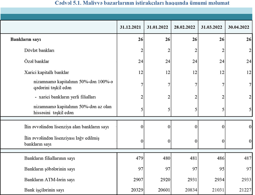 · 30 aprel 2022-ci il tarixinə fəaliyyət göstərən 26 bankın filiallarının sayı 487, şöbələrinin sayı 97, ATM-lərin sayı 2933 olmuşdur. Hesabat ayında bank sektorunda çalışanların sayı 0.9% (196 nəfər) artaraq 21 min 227 nəfər təşkil etmişdir.