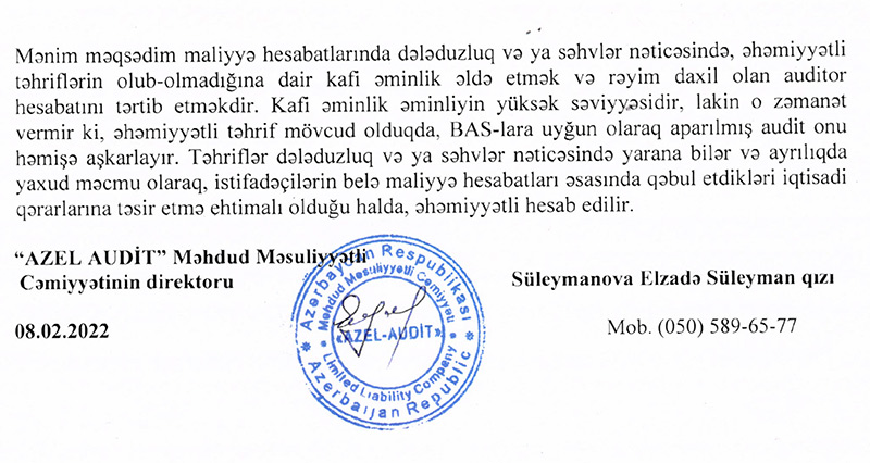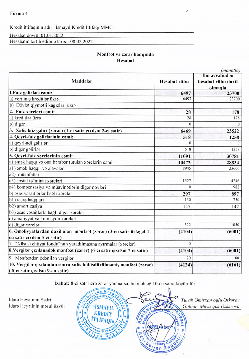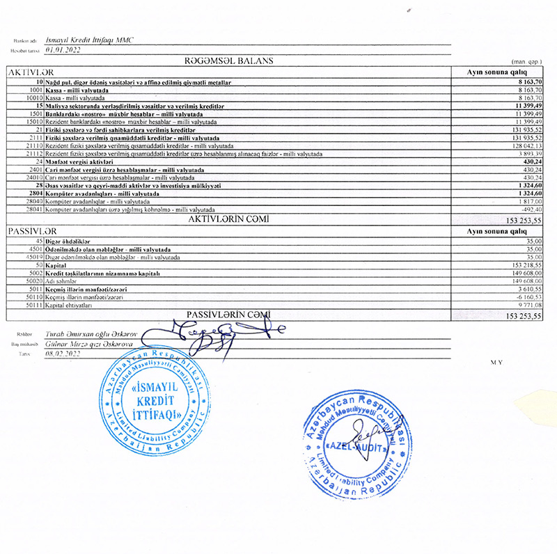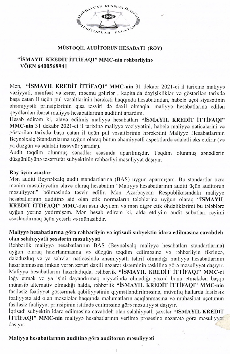 "İsmayıl Kredit İttifaqı" MMC-nin 31 dekabr 2021-c il tarixində bitən il üzrə maliyyə hesabatları.