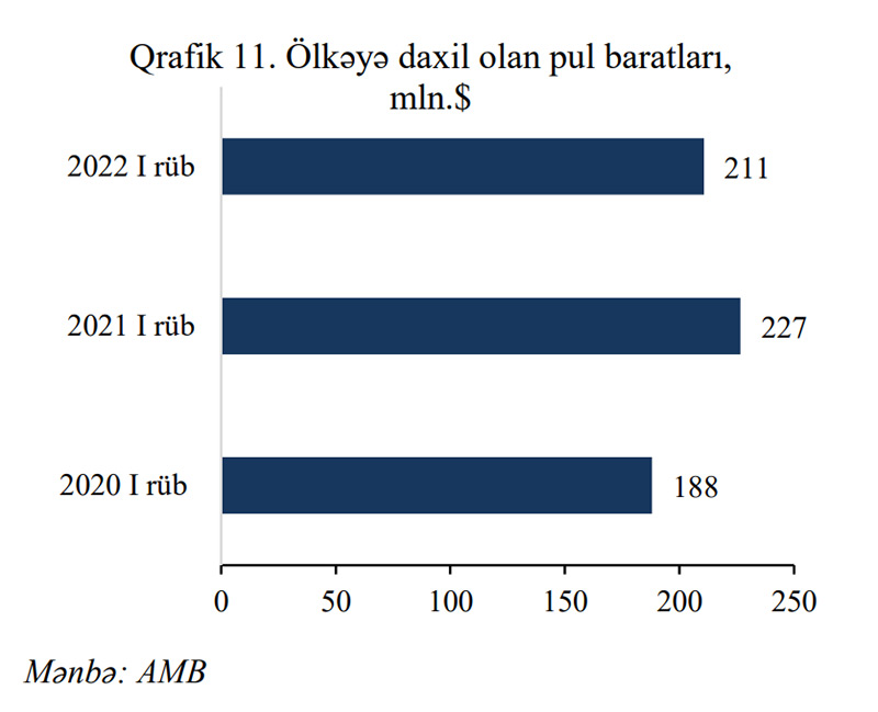 2022-ci ilin 1-ci rübündə Azərbaycana daxil olan pul baratları 227 milyon dollar təşkil etmişdi.