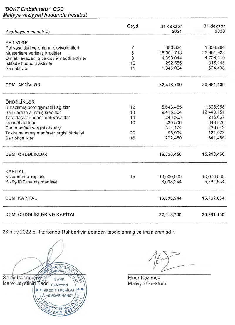 2020-ci illə müqayisədə 2021-ci ildə “BOKT Embafinans”ın kredit portfeli (müştərilərə verilmiş kreditlər) 2 milyon 39 min 790 manat və ya 8,5% artaraq 26 milyon 1 min 713 manata çatıb. Ötən il “BOKT Embafinans”ın cəmi aktivləri isə 4,6% artaraq 32 milyon 418 min 700 manata yüksəlib.