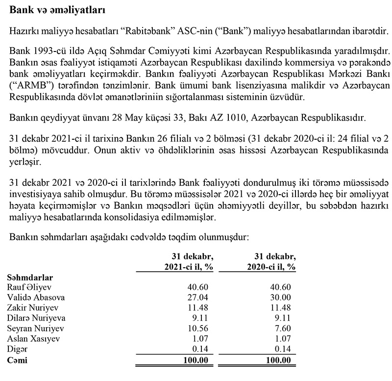 "Rabitəbank"ın səhmlərinin qalan hissəsi əvvəlki qaydada Rauf Əliyevə (40,6%), Zakir Nuriyevə (11,48%), Dilarə Nuriyevaya (9,11%), Aslan Xasiyevə (1,07%) və 12 hüquqi şəxsə (0,14%) məxsusdur.