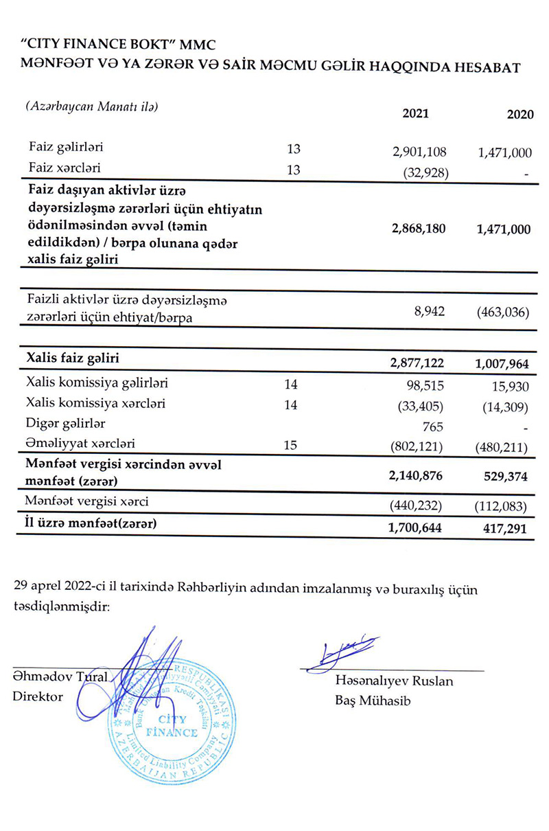 Lombard və avtomobil kreditlərinin verilməsilə məşğul olan "City Finance BOKT" MMC 2021-ci ili 1 milyon 701 min manat xalis mənfəət ilə başa vurub. Halbuki, təşkilat 2020-ci ili 417 min manat xalis mənfəət ilə bağlamışdı. Beləliklə, 2020-ci illə müqayisədə 2021-ci ildə "City Finance"ın xalis mənfəəti 4,1 dəfə artıb.