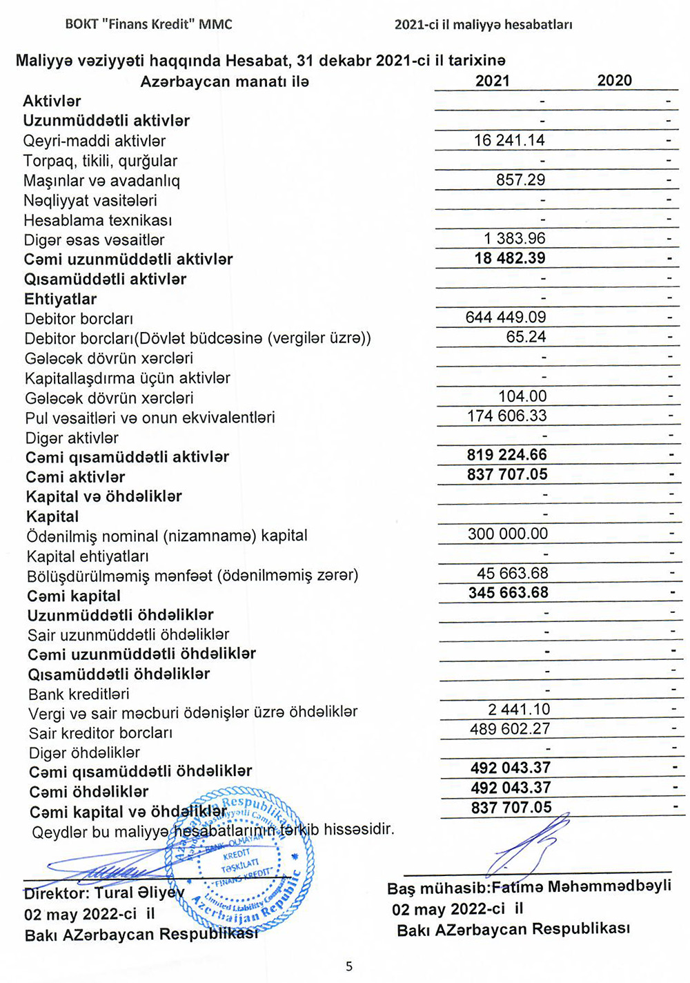 Marja.az Təşkilatın 31 Dekabr 2021-ci il tarixində bitən il üzrə maliyyə hesabatlarına istinadən xəbər verir ki, BOKT “Finans Kredit” ötən ili 46 min 246 manat xalis mənfəət ilə başa vurub.