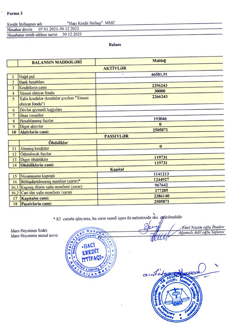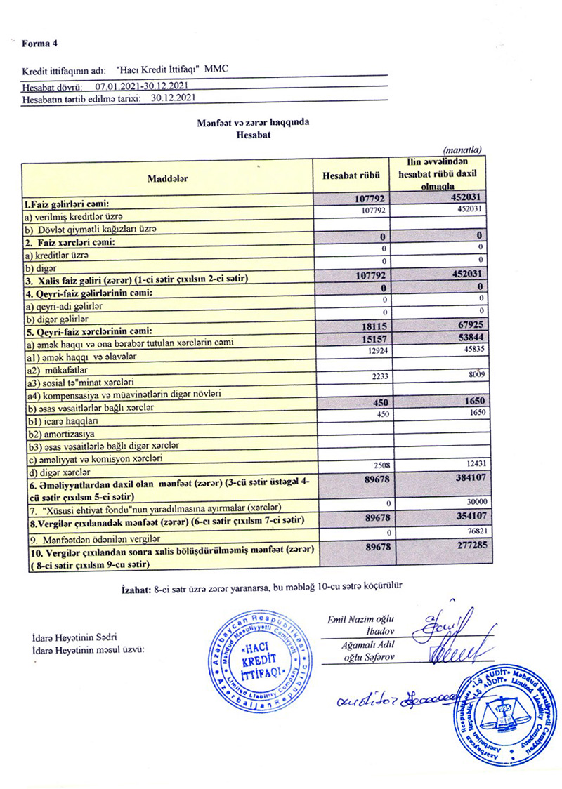Lənkəranın Boladi kəndində fəaliyyət göstərən "Hacı Kredit İttifaqı" MMC 2021-ci ili 277 min manat xalis mənfəət ilə başa vurub.
