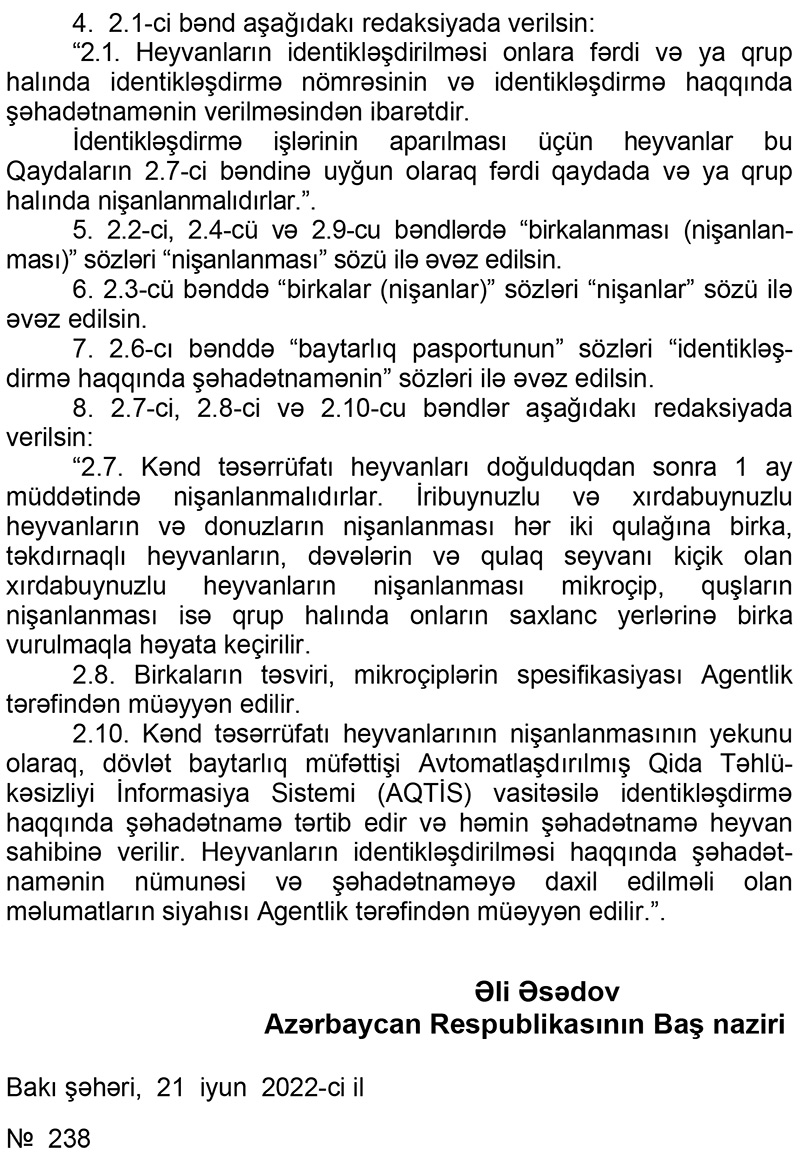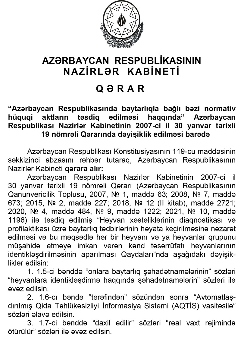 “Heyvan xəstəliklərinin diaqnostikası və profilaktikası üzrə baytarlıq tədbirlərinin həyata keçirilməsinə nəzarət edilməsi və bu məqsədlə hər bir heyvanı və ya heyvanlar qrupunu müşahidə etməyə imkan verən kənd təsərrüfatı heyvanlarının identikləşdirilməsinin aparılması Qaydası”nda dəyişikliklər ilə əlaqədar olaraq Nazirlər Kabinetinin izahında bildirilir: