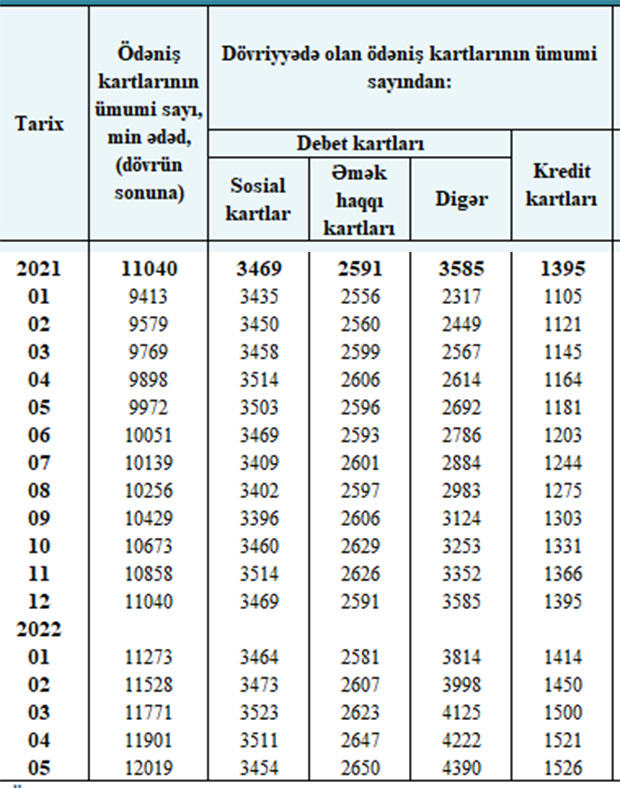 2022-ci ilin ilk 5 ayında ödəniş kartlarının sayı 979 min ədəd artıb, o cümlədən sosial kartların sayı 15 min ədəd azalıb, əməkhaqqı kartlarının sayı 59 min ədəd, digər debet kartlarının sayı 805 min ədəd, kredit kartlarının sayı isə 131 min ədəd artıb.