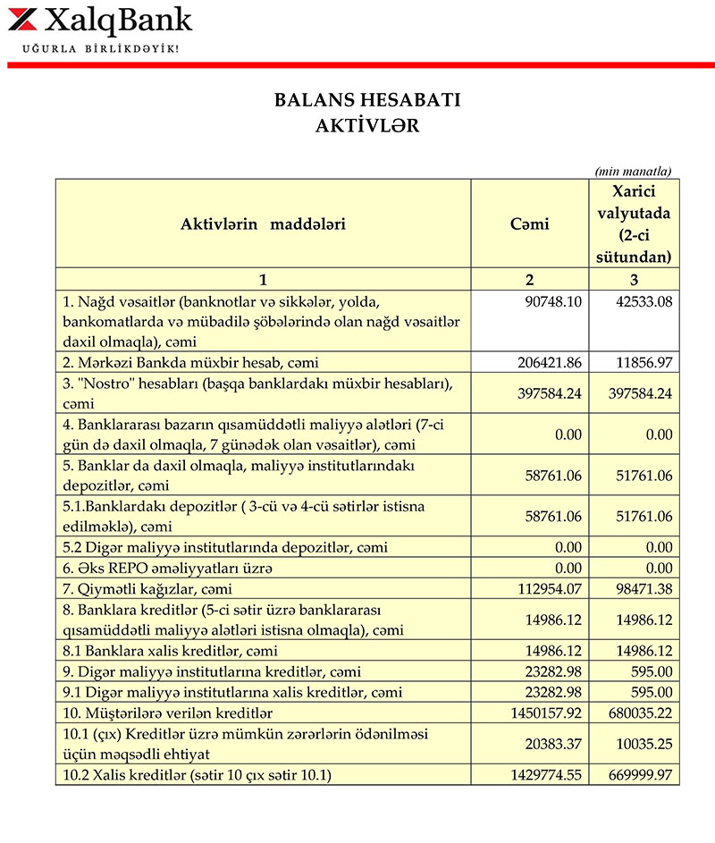 30 İyun 2022-ci il tarixində "Xalq Bank" ASC 2 milyard 532 milyon 370 min manat cəmi aktivlərə, o cümlədən 1 milyard 450 milyon 158 min manat kredit portfelinə (müştərilərə verilmiş kreditlər) malik olub. Bank 2021-ci ilin sonunda 2 milyard 339 milyon 392 min manat cəmi aktivlərə və 1 milyard 406 milyon 980 min manat kredit portfelinə malik idi. Beləliklə, 2022-ci ilin ilk 6 ayında "Xalq Bank"ın cəmi aktivləri 192 milyon 978 min manat və ya 8,2%, kredit portfeli isə 43 milyon 178 min manat və ya 3,1% artıb.
