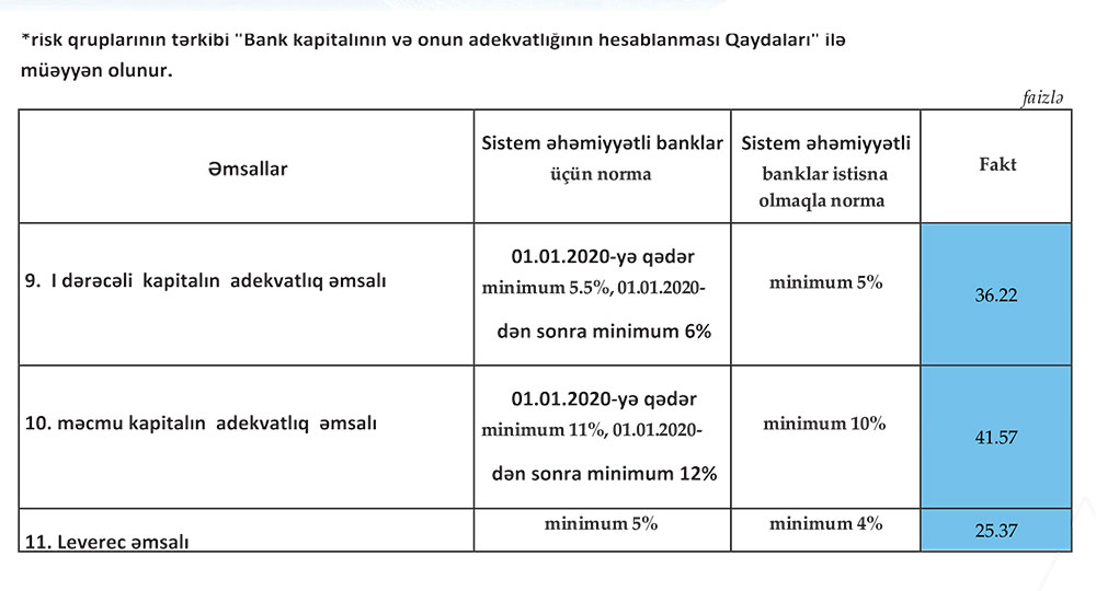 Bankın məcmu kapitalının və I dərəcəli kapitalının adekvatlıq əmsalı Mərkəzi Bankın normalarından dəfələrlə artıqdır. Belə ki, məcmu kapitalın adekvatlıq əmsalı MB normasına əsasən 10% həddində müəyyən edilmişdir ki, bankın bu göstəricisi 42% təşkil edir. I dərəcəli kapitalın norması isə 5% olsa da, bankda 36%-dən çoxdur.