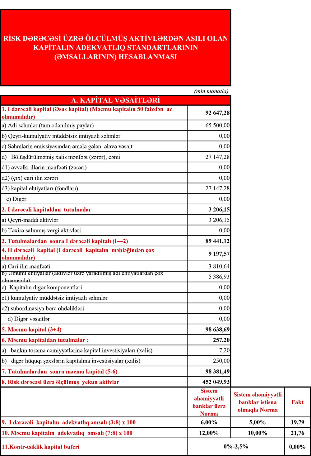 Təqdim edilən maliyyə nəticələrinə görə bankın cəmi aktivləri də ötən ilin müvafiq dövrü ilə müqayisədə 26 % artaraq 44 mln manatı keçib. Bankın cəmi kapitalı isə ötən ilin sonundan 19 mln 985 min manat artaraq 102 mln manatı keçmişdir.