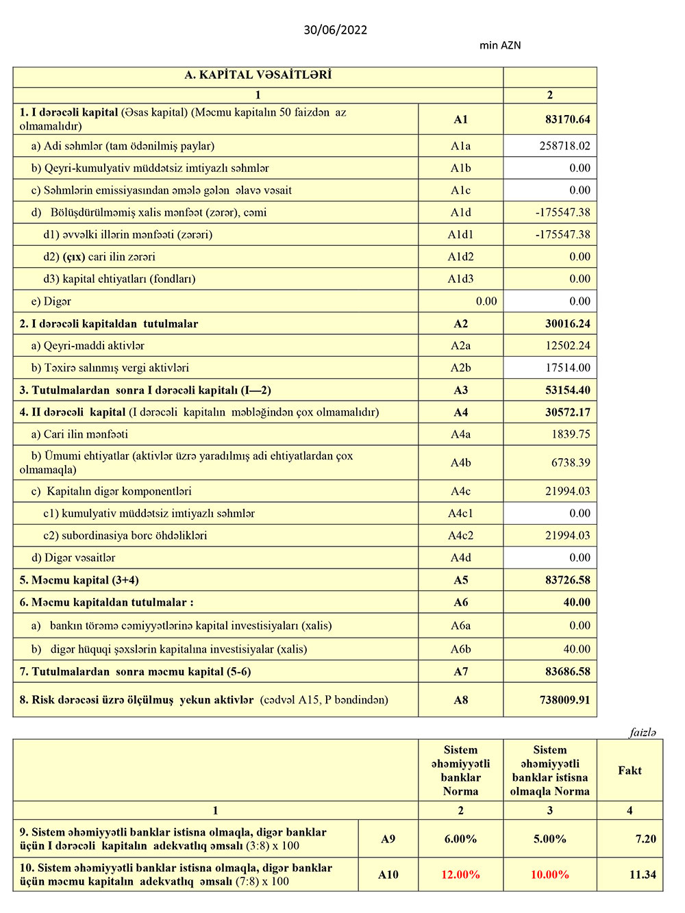 Hazırda Bankın cəmi məcmu kapitalı 83.7 milyon manat təşkil edir ki, bu da minimum məcmu kapital normasından (50 milyon manat) 33.7 milyon manat çoxdur.