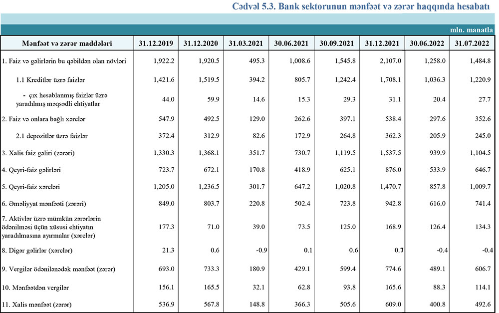 Azərbaycanın bank sektoru 2022-ci ilin 7 ayını (yanvar-iyul) 492.6 milyon manat xalis mənfəət ilə başa vurub. 2021-ci ilin eyni dövrü ilə müqayisədə bank sektorunun xalis mənfəəti 83.7 milyon manat və ya 20,5% artıb. 2022-ci ilin iyun ayı ilə müqayisədə iyul ayında bank sektorunun xalis mənfəəti 91.8 milyon manat artıb.