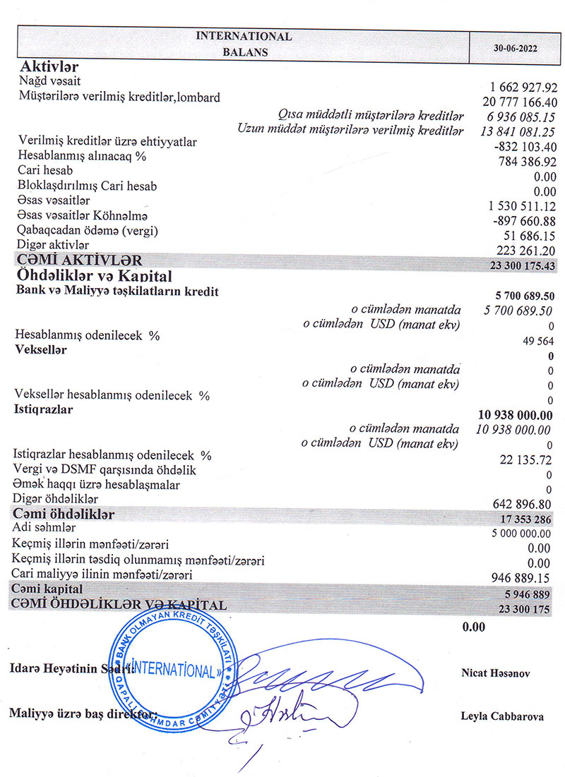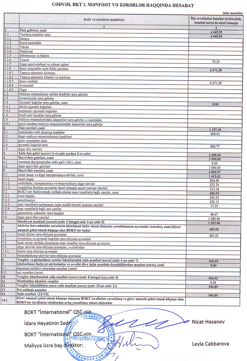 Xatırladaq ki, 2021-ci ildə BOKT "İnternational" QSC-nin faiz gəlirləri 8 milyon 165 min manat, haqq və komissiya gəlirləri 198 min manat, xalis mənfəəti 410,5 min manat təşkil etmişdi. Kredit təşkilatı 2020-ci ili 202 min manat xalis mənfəət ilə bağlamışdı.