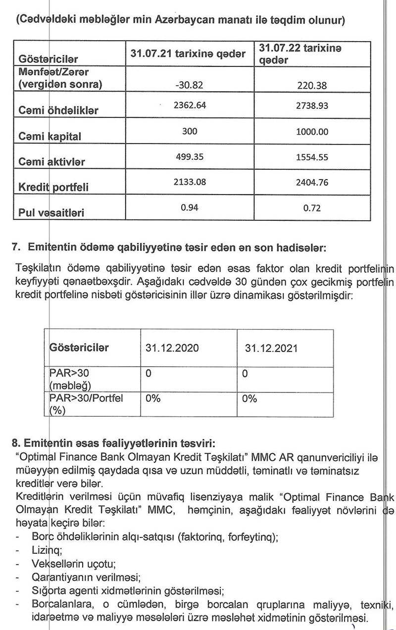 "Optimal Finance Bank Olmayan Kredit Təşkilatı" MMC 2022-ci ilin 1-ci yarısını (yanvar-iyun dövrünü) 220 min manat xalis mənfəət ilə başa vurub. Halbuki, təşkilat ötən ilin eyni dövrünü 34 min manat xalis zərər ilə bağlamışdı. "Optimal Finance" tam 2021-ci ildə isə 81 min manat xalis mənfəət əldə etmişdi.