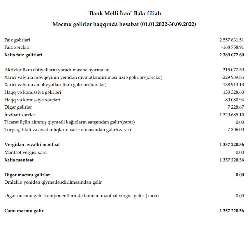 "Bank Melli İran" Bakı filialı 2022-ci ilin 9 ayını (yanvar-sentyabr) dövrünü 1 milyon 357 min 220 manat xalis mənfəət ilə başa vurub.