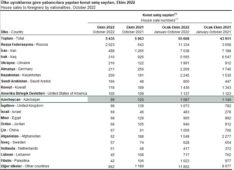 Oktyabr ayında Rusiya vətəndaşları Türkiyədən 2 min 23 ev, İran vətəndaşları 498 ev, İraq vətəndaşları 310 ev, İkrayna vətəndaşları 216 ev alıblar.
