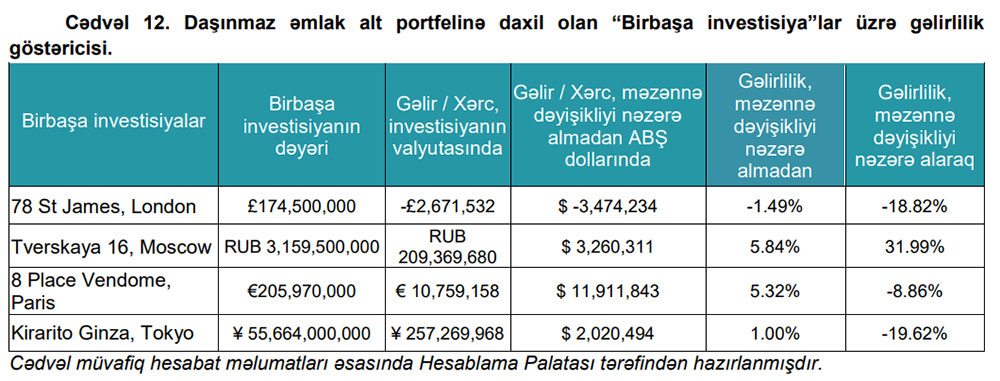 “Cari ilin 9 ayında Fondun daşınmaz əmlak alt portfeli üzrə 9,86% gəlirliliyi olmuş, gəlirlilikdə “Fond investisiyaları” və “Müştərək investisiyalar” əsas payı təşkil etmişdir. Fondun daşınmaz əmlak alt portfelinin strukturuna daxil olan “Birbaşa investisiyalar” üzrə məzənnə dəyişikliyi nəzərə alınmaqla bir əmlakı üzrə gəlirlilik müşahidə edilsə də digər əmlaklar üzrə mənfi gəlirlilik olmuşdur. Əvvəlki rəylərdə olduğu kimi “Birbaşa investisiya” aləti üzrə daşınmaz əmlak bazarının tələblərinə uyğun mövcud iqtisadi vəziyyət nəzərə alınmaqla yeni tənzimləmə mexanizmlərinin tətbiqinə zərurət olduğu qənaətindəyik”,- Rəydə deyilir.