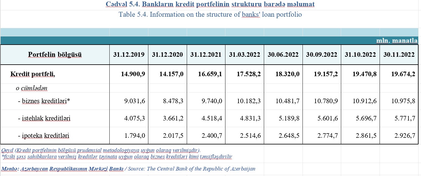 Bankların istehlak və ipoteka kreditləri portfeli 8,7 milyard manata çatır.30 Noyabr 2022-ci il tarixində bankların cəmi kredit portfeli 19 milyard 674,2 milyon manat təşkil edib.