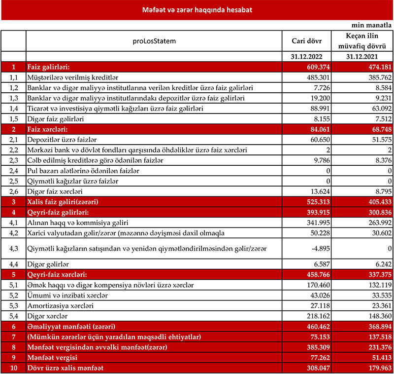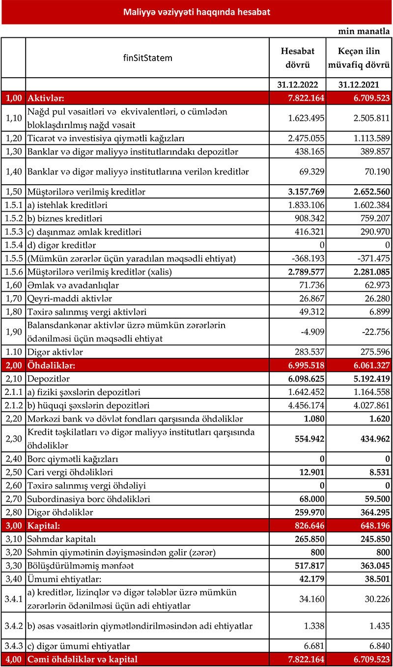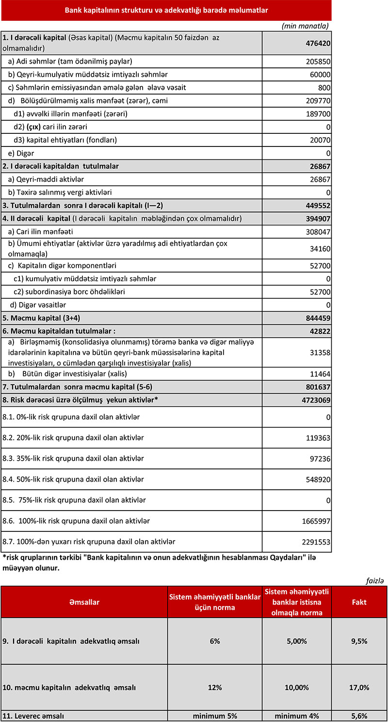 Bankın 1 yanvar 2023-cü il tarixinə tutulmalardan sonra məcmu kapitalı 802 milyon manat, adi və imtiyazlı səhmlər isə 265 milyon manat təşkil edir.