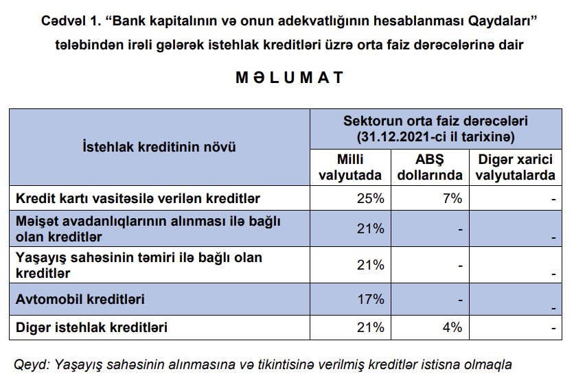 Orta faiz dərəcəsi - milli valyutada kredit kartı vasitəsilə verilən kreditlər üzrə 1 faiz bəndi artaraq 26%-ə, məişət avadanlıqlarının alınması ilə bağlı olan kreditlər üzrə 2 faiz bəndi artaraq 23%-ə, yaşayış sahəsinin təmiri ilə bağlı olan kreditlər üzrə 2 faiz bəndi artaraq 23%-ə yüksəlib.