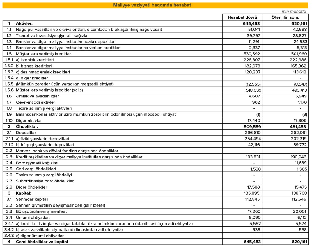 Kredit portfeli 530 milyon 592 min manat olub, 2024-cü ilin sonundakı 501 milyon 960 min manatla müqayisədə 28 milyon 632 min manat və ya 5,7% artım göstərib.