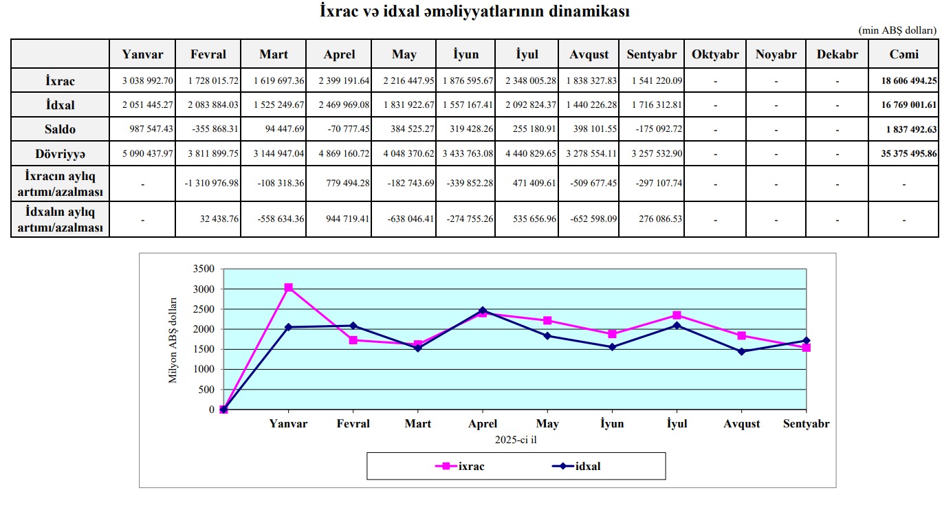Sentyabrda Azərbaycanın ixracının həcmi 1 milyard 541 milyon 220 min dollar, idxalının həcmi 1 milyard 716 milyon 313 min dollar, mənfi saldo 175 milyon 93 min dollar olub.
