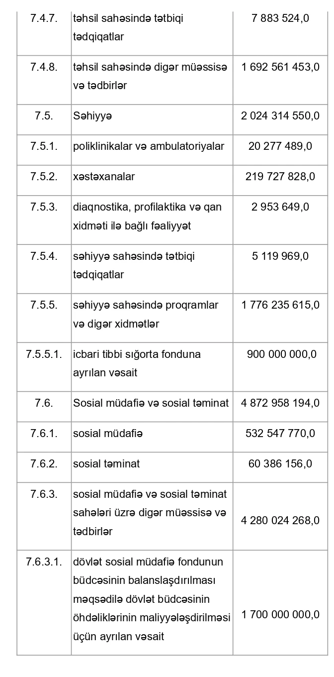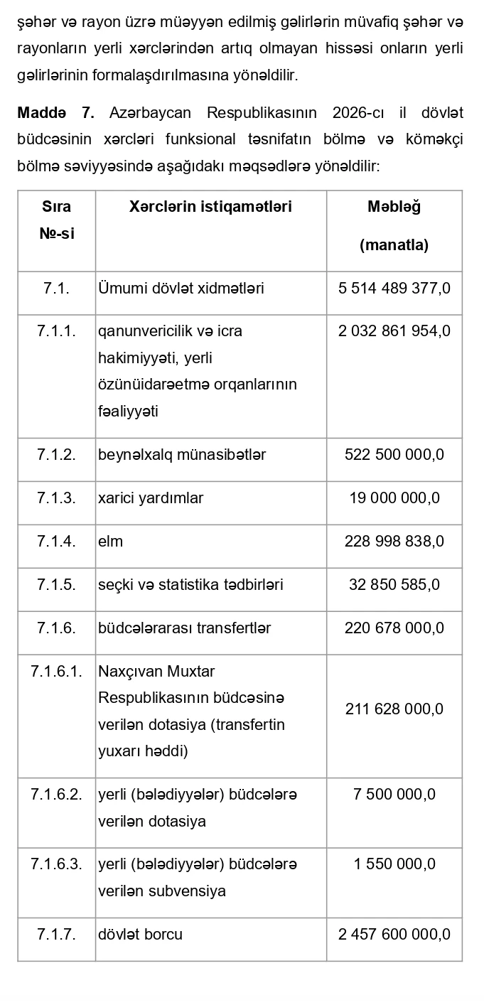 Azərbaycan Respublikasının 2026-cı il icmal büdcəsinin xərclərinin yuxarı həddinin məbləği 48 milyard 839 milyon 322,6 min manat, 2026-cı il icmal büdcəsi kəsirinin yuxarı həddinin məbləği 16 milyard 902 milyon 226,6 min manat məbləğində nəzərdə tutulur.