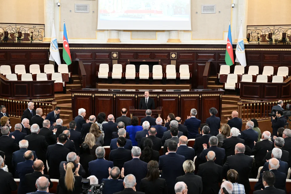 Mən 10 il bundan əvvəl - Akademiyanın 70 illiyində bax bu salonda alimlər qarşısında çıxış etmişdim və çalışırdım ki, bu 10 il ərzində ölkə qarşısında duran bütün başqa vəzifələrlə yanaşı, elmin inkişafına da öz dəstəyimi göstərim. Bu gün bəzi fikirlərimi sizinlə bölüşmək istəyirəm. Çünki son 10 il ərzində həm dünyada, həm Azərbaycanda köklü dəyişikliklər baş vermişdir. Dünya iqtisadiyyatı tamamilə dəyişmiş, dünyada gedən siyasi proseslər, müharibələr, hərbi toqquşmalar, beynəlxalq hüququn pozulması, mövcud olan qaydaların tamamilə aradan qaldırılması göz önündədir. Azərbaycana gəldikdə, son 10 il bizim üçün inkişaf və zəfərlərlə zəngin illər olmuşdur. Əsas vəzifə - torpaqlarımızın azad edilməsi, ərazi bütövlüyümüzün bərpası, suverenliyimizin bərpası layiqincə təmin edilmişdir. Bu gün Azərbaycan bütün suveren torpaqlara sahibdir. Bizim ərazimizdə işğalçı qüvvələr yoxdur. Bizim ərazimizdə xarici hərbi birləşmələr yoxdur. Bu gün biz bu torpaqlarda qurub-yaradırıq. Biz bir neçə gündən sonra şanlı Zəfərimizin beşinci ildönümünü qeyd edəcəyik. Son beş il ərzində dünyada bir çox yerlərdə müharibələr, toqquşmalar, münaqişələr baş verirdi və hər şey müqayisə ilə ölçülür. Bunu da alimlər yaxşı bilir. Deyə bilərəm ki, bizim qədər parlaq, tam və mütləq Qələbə qazanan ikinci ölkə olmamışdır.