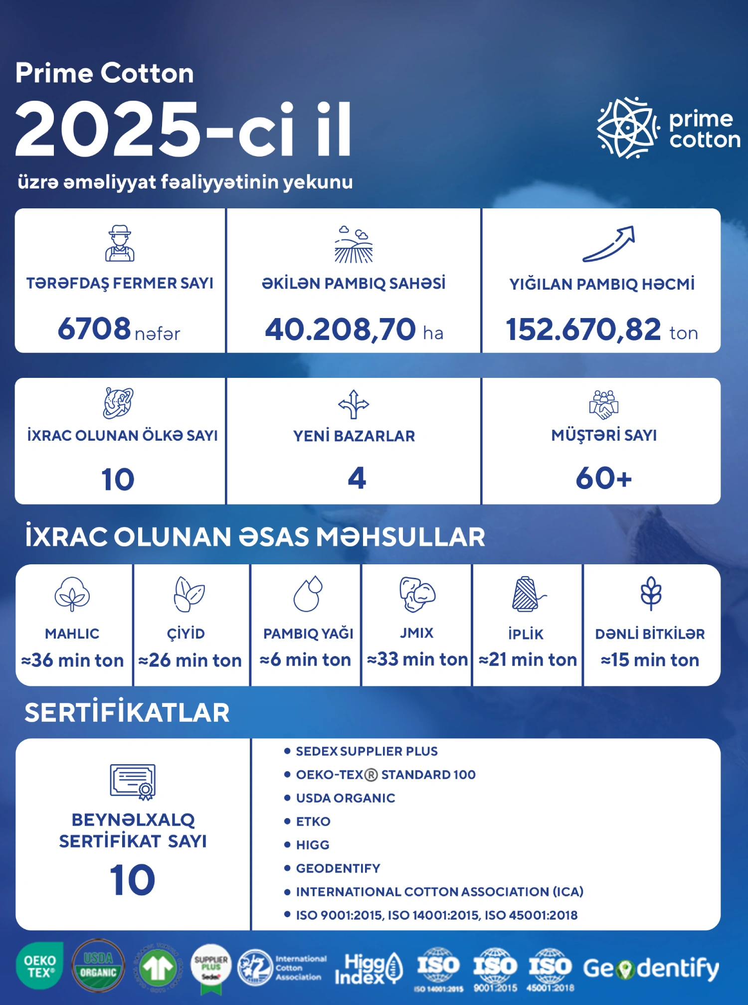 “2025-ci il Prime Cotton üçün təkcə istehsal həcmlərinin artımı deyil, sistemli idarəetmənin və fermerlərlə qurulan sağlam tərəfdaşlığın real nəticəsidir. Minlərlə fermeri, on minlərlə hektar sahəni və beynəlxalq bazarları əhatə edən bu fəaliyyət modeli göstərir ki, Azərbaycan pambığı artıq keyfiyyət, izlənəbilənlik və etimad baxımından qlobal səviyyədə qəbul olunur.”