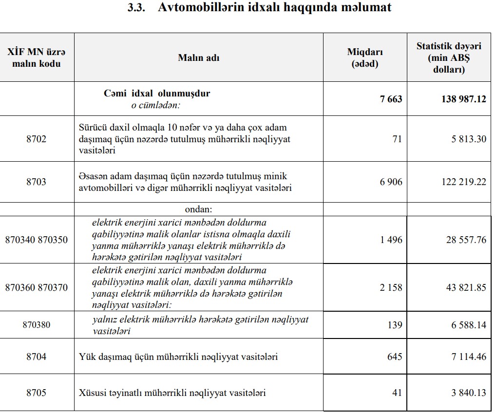 Beləliklə, Azərbaycana avtomobil idxalı dəyər ifadəsilə 37 milyon 55 min dollar və ya 27% artıb, say ifadəsilə 72 ədəd və ya 0,9% azalıb.