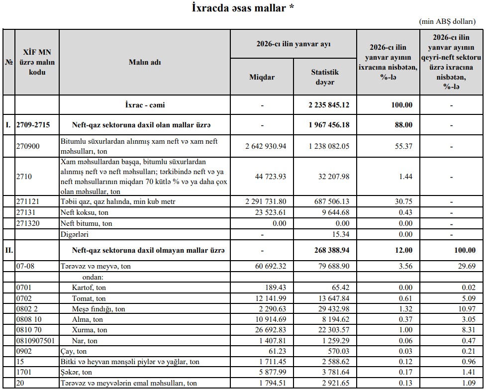 2026-cı ilin yanvar ayında Azərbaycanın ən çox ixrac və idxal etdiyi mallar.