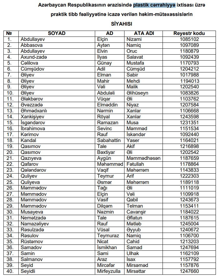Azərbaycan plastik cərrahiyyə həkimləri siyahısı plastik cərrahiyyə ixtisası Azərbaycan praktik tibb fəaliyyətinə icazə Səhiyyə Nazirliyi qərarı APA səhiyyə xəbərləri Azərbaycan tibb mütəxəssisləri siyahısı lisenziyalı plastik cərrahlar plastik cərrahiyyə üzrə icazə dəyişiklik səhiyyə sahəsində yeniliklər Azərbaycanda plastik cərrahiyyə fəaliyyəti tibb fəaliyyəti icazəsi 2026 həkim-mütəxəssis əlavə olunub Azərbaycan səhiyyə sistemi tibb lisenziyası siyahısı plastik əməliyyat icazəsi