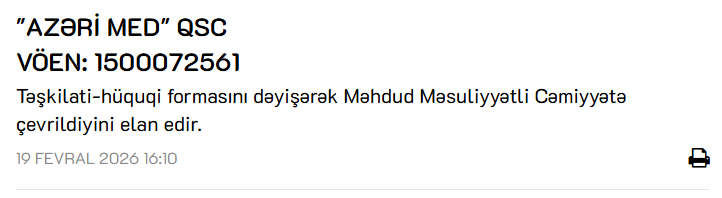 Marja.az xəbər ver ki, Qapalı Səhmdar Cəmiyyəti (QSC) formasında fəaliyyət göstərən "AZƏRİ MED" şirkəti Məhdud Məsuliyyətli Cəmiyyətə (MMC) çevrildiyini elan edib.