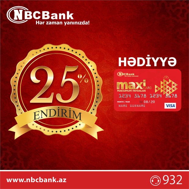 Dekabr ayının 1-dən 30-na qədər nağd istehlak krediti götürən müştərilərə kredit faizlərinə və xidmət haqqına 25% endirim etməklə yanaşı Maxi Card hədiyyə ediləcək.