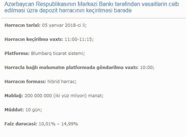 Qeyd edək ki, indiyədək keçirilən hərraclarda müddət 14 gün təşkil edirdi. Depozit hərraclarına başlanan ilkin vaxtlarda isə müddət 28 gün idi.