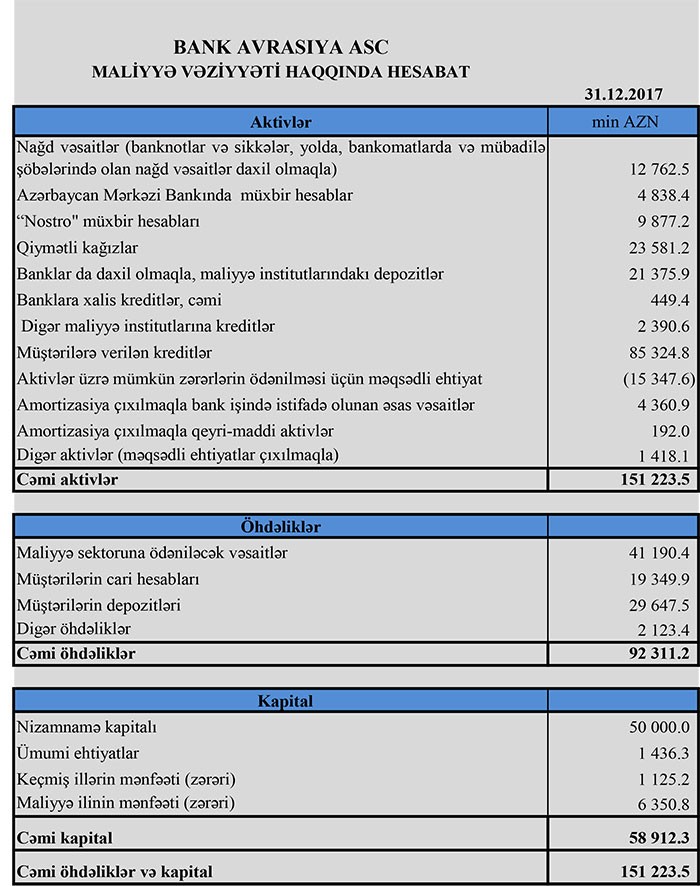 31 Dekabr 2017-ci il tarixində “Bank Avrasiya” ASC 151 milyon 223 min manat cəmi aktivlərə, 92 milyon 311 min manat cəmi öhdəliklərə və 58 milyon 912 min manat cəmi balans kapitalına malik olub.