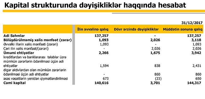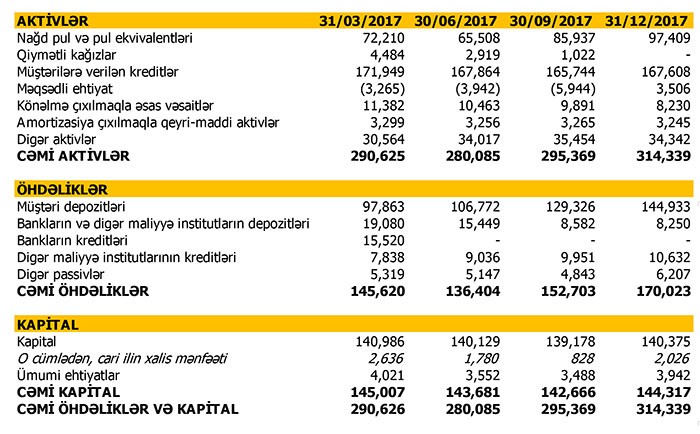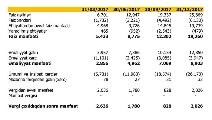 "2017-ci il üzrə təxminən 2 milyon manat xalis mənfəət 2016-cı ilin göstəricisini 5 dəfə üstələməklə yanaşı, son 3 ilin ən yüksək mənfəət göstəricisidir",- Bankın məlumatında deyilir.
