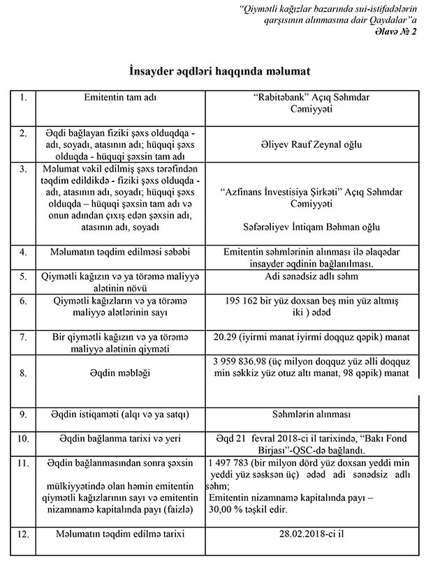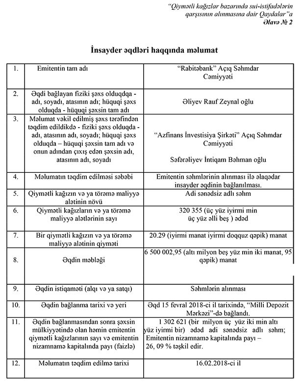 Əliyev Rauf Zeynal oğlu iki müqavilə ilə hər birinin nominal dəyəri 20,29 manat olan 515 517 səhmi əldə edib (cəmi 10 459 838 manat). Nəticədə onun Bankın nizamnamə kapitalında payı 1 497 783 ədəd səhmlə 30%-ə qalxıb. Rauf Əliyev 15 Fevral tarixində bağlanmış müqavilə ilə 6 500 002,95 manatlıq, 21 fevral 2018-ci il tarixində bağlanmış müqavilə ilə isə 3 959 836.98 manatlıq səhm alınıb.