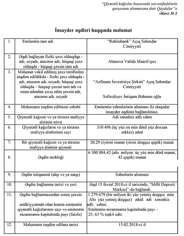 2-ci insayder əqdi də Bankın 554 814 ədəd səhminin əldə olunması ilə bağlı idi. Həmin səhmləri də “Azfinance” investisiya şirkətinin vasitəçiliyi ilə Validə Maarif qızı Abasova əldə etmişdi. Bununla da, onun “Rabitəbank”dakı səhmlərinin sayı 969 181-ə, Bankın nizamnamə kapitalındakı payı isə 22,22%-ə çatmışdı. Hər iki şəxs yeni buraxılmış səhmləri də əldə etdikdən sonra Bankda paylarını artırıblar.