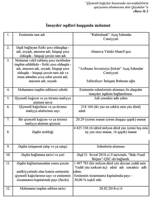 Fevral ayının 5-də Bakı Fond Birjasında “Rabitəbank” ASC-nin səhmlərinin alqı-satqısı üzrə 2 insayder əqdi bağlanmışdı.