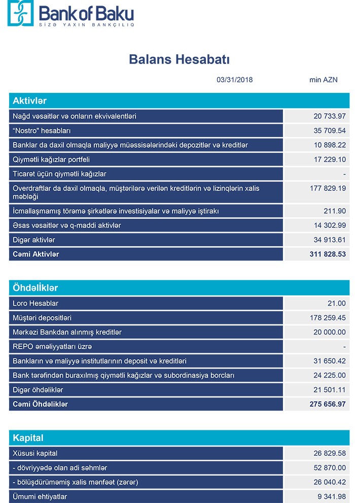 31 Mart 2018-ci il tarixində “Bank of Baku” ASC 311 milyon 828 min manat cəmi aktivlərə, 275 milyon 656 min manat cəmi öhdəliklərə və 36 milyon 171 min manat cəmi balans kapitalına malik olub.