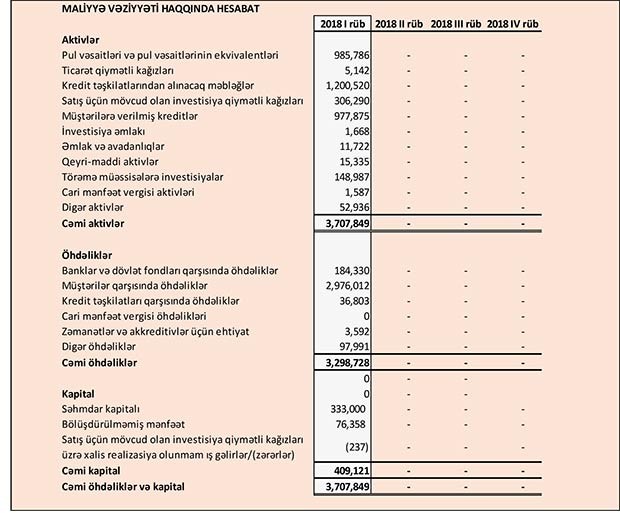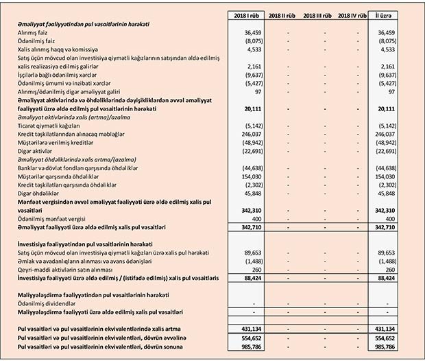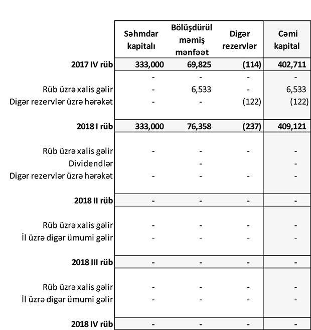 2017-ci ilin ilk rübündə faiz qazandıran aktivlər üzrə dəyərsizləşmə üçün ehtiyata ayırma 13 milyon 327 min manat ikən, 2018-ci ilin ilk rübündə 14 milyon 166 min manat təşkil edib.